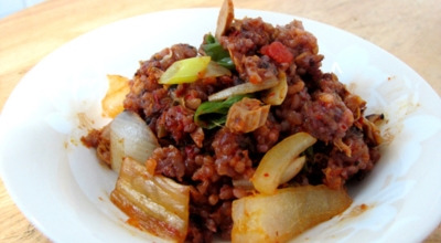 다진 돼지고기를 먼저 볶은 후 묵은지를 넣고 볶아줍니다. 묵직한 감칠맛이 인상적입니다.