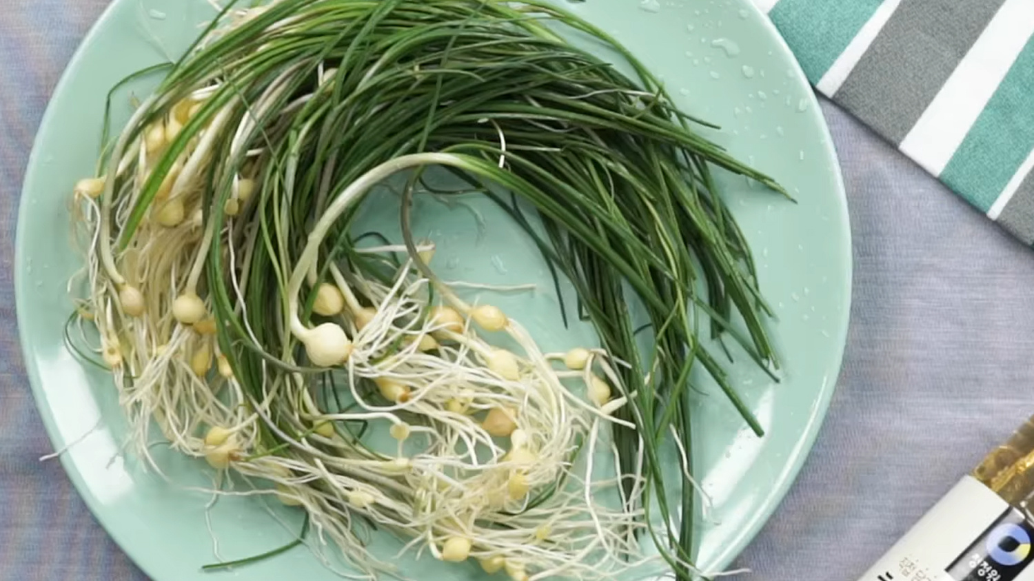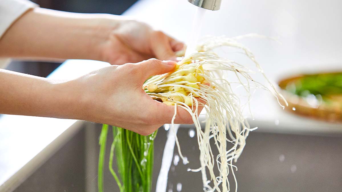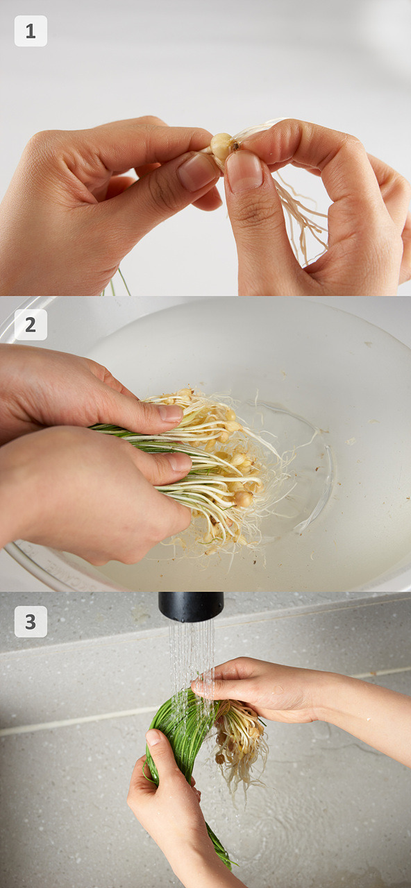 먼저 달래 뿌리 끝부분의 흙을 제거한 뒤 흐르는 물에 여러 번 깨끗이 씻어줍니다. 특히 뿌리 사이에 흙이 남지 않도록 손으로 살살 흔들어가며 씻는 것이 좋습니다.