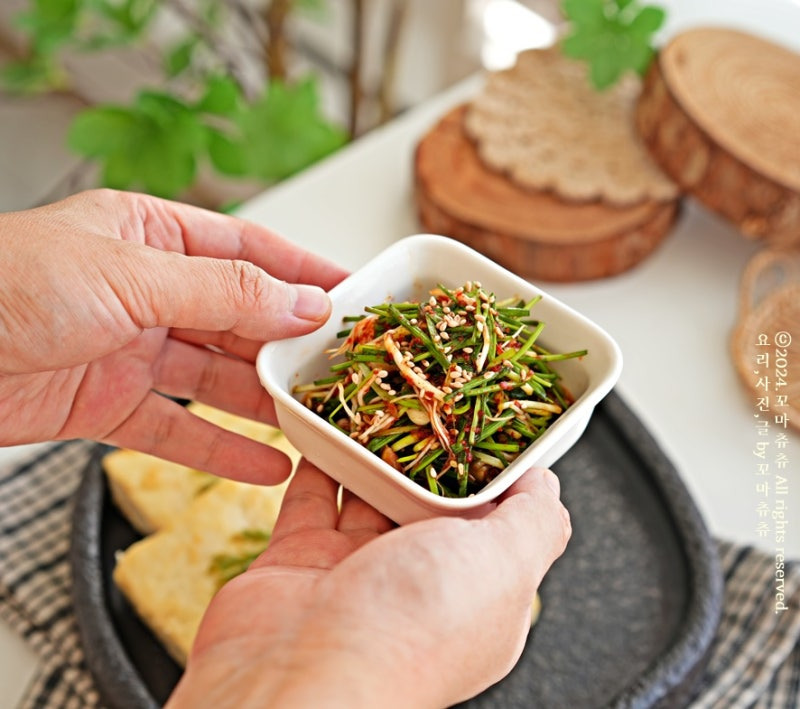 깨끗하게 씻은 달래는 물기를 제거한 뒤 약 3~4cm 길이로 잘라 준비합니다. 너무 길게 자르면 먹기 불편할 수 있으므로 적당한 길이를 유지하는 것이 좋습니다.