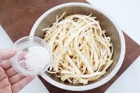 손질한 도라지에 소금과 설탕을 넣고 손으로 바락바락 주물러 줍니다. 이 과정은 도라지 속 쓴맛 성분을 빼내는 핵심 단계입니다. 보통 10분 정도 주무른 뒤 잠시 그대로 두었다가 흐르는 물에 여러 번 헹구면 훨씬 부드럽고 먹기 좋은 상태가 됩니다.