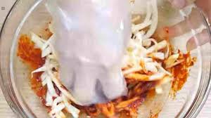 쓴맛을 제거하고 물기를 짠 도라지에 양념을 넣어 버무릴 차례입니다. 양념은 한 번에 모두 넣기보다는 먼저 절반 정도만 넣고 섞어본 뒤 나머지를 추가하는 것이 좋습니다. 그래야 양념이 한쪽에만 몰리지 않고 전체에 고르게 배게 됩니다.