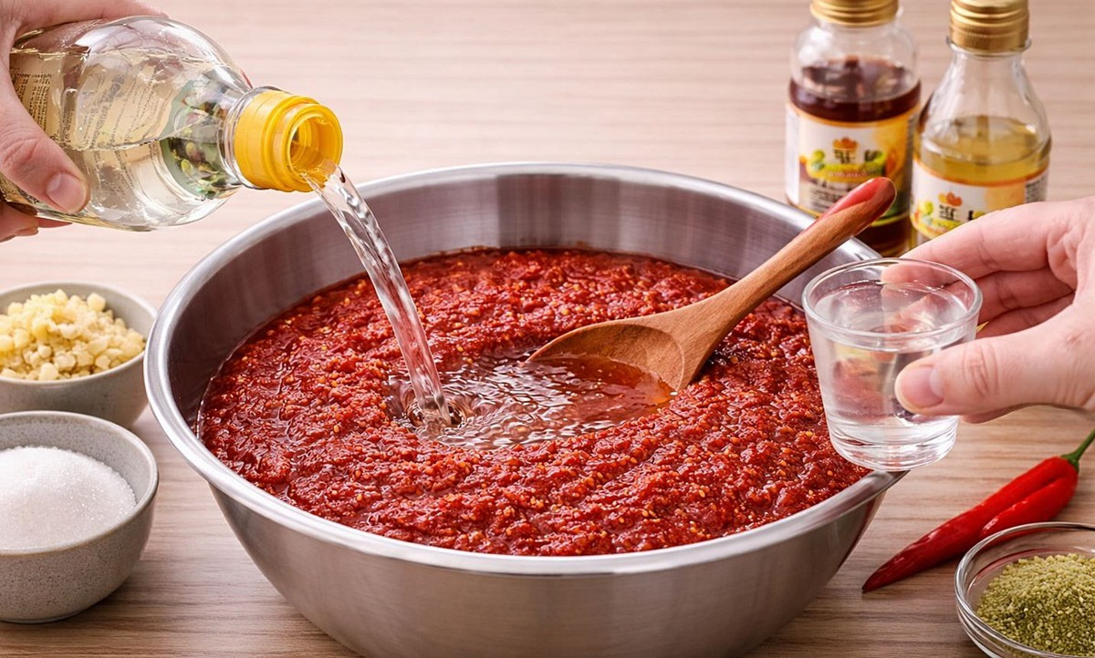 식초를 아주 소량씩 추가하면서 간을 보면 됩니다. 처음부터 너무 많이 넣으면 도라지 향이 약해질 수 있으니 조금씩 조절하는 것이 좋습니다.