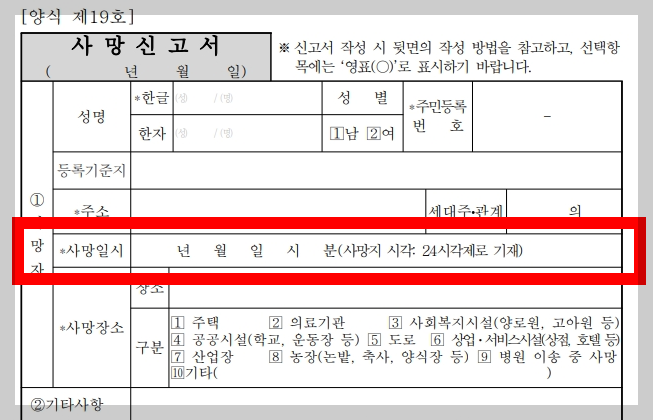 - 사망의 연월일과 시각을 24시각제로 기재해야 합니다.
