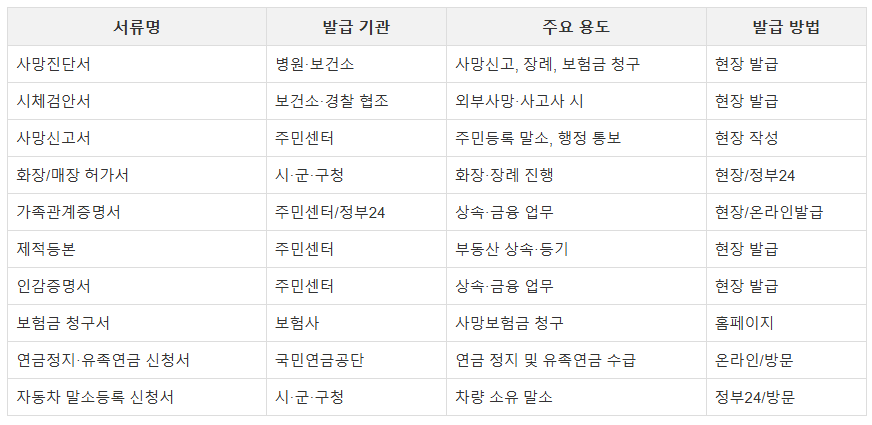 아래 표는 사망 직후부터 장례·사후 행정까지 필요한 서류를 정리한 것입니다.
