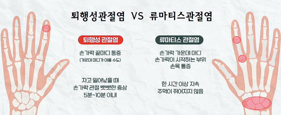 - 증상 특징: 시간이 지날수록 뼈가 튀어나오거나 마디가 굵어지고, 뻣뻣함과 통증이 동반됨