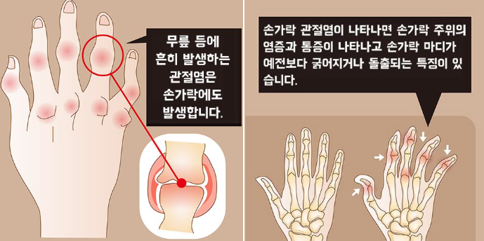 - 손가락 외에도 손목·발목 등 여러 관절 통증