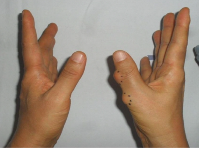 - 심한 경우 손가락이 구부러진 상태로 고정