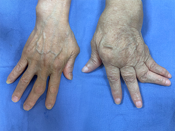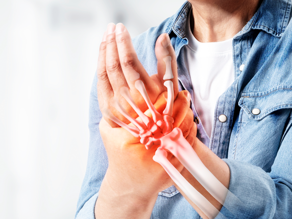 손가락, 손목 등 작은 관절 양쪽에 동시에 통증과 붓기가 생기며, 아침에 손이 잘 펴지지 않는 특징이 있습니다.