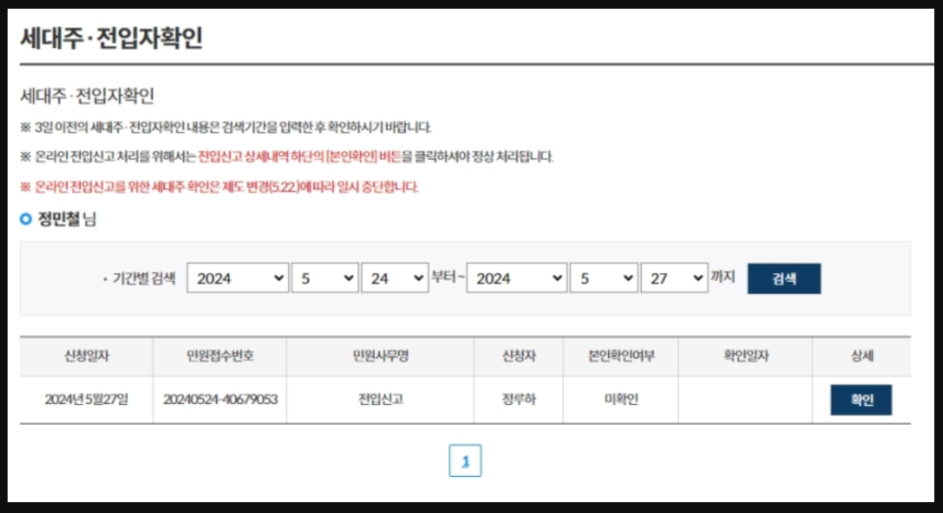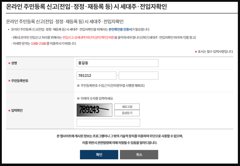 - '세대주·전입자 확인' 화면에서 신고 내용을 확인하고, 오른쪽 ‘확인’ 버튼을 클릭하면 절차가 완료됩니다.