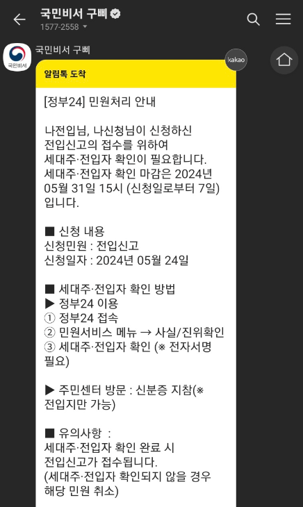 - 기재된 번호로 신청 관련 알림 메시지가 발송되며, 모든 전입 대상자는 해당 문자 수신 후 '세대주 및 전입자 확인' 절차를 완료해야 신고가 정상 접수됩니다.