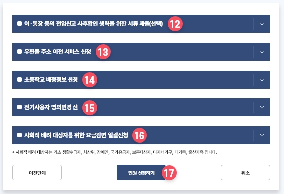 - 화면에 표시되는 여러 항목 중 본인의 상황에 맞는 옵션을 선택한 후, 하단의 ‘민원 신청하기’ 버튼을 클릭하여 신고 절차를 마무리합니다.
