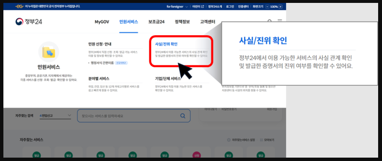 - 카카오톡 메시지를 수신한 후, 정부24 홈페이지에서 ‘민원서비스 > 사실/진위 확인’ 메뉴를 선택합니다.