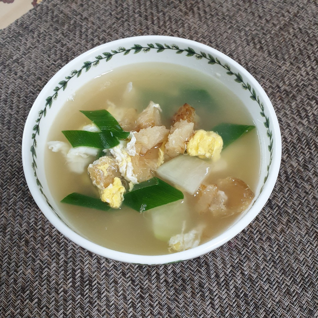 기본적으로 황태채 1줌, 무 150g 정도, 두부 반 모, 대파 반 대, 계란 1개, 물 1.5리터 정도를 준비하면 2~3인분 기준으로 알맞습니다. 여기에 참기름, 국간장, 다진 마늘, 소금, 후추 정도가 들어갑니다.