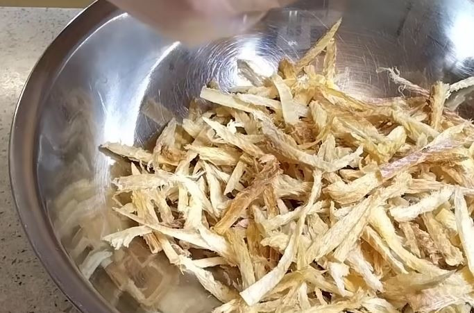 먼저 황태채를 찬물에 5분 정도 담가줍니다. 너무 오래 담가두면 황태 특유의 맛이 빠질 수 있기 때문에 짧게 불리는 것이 좋습니다. 이후 손으로 가볍게 물기를 짜주고, 너무 긴 부분은 먹기 좋은 길이로 잘라주면 됩니다.